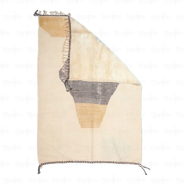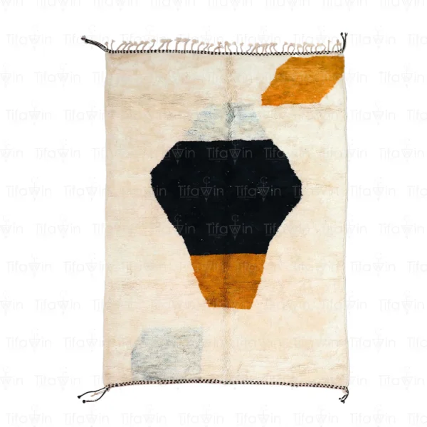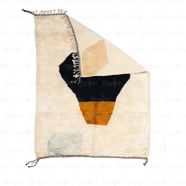 This Moroccan rug features a striking abstract design in neutral tones. The thick pile and intricate knotwork create a luxurious and textured piece.